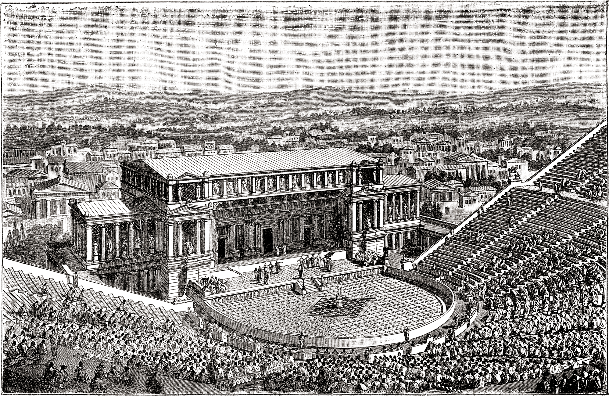 هو مسرح الهواء الطلق وهو نموذج من المسارح اليونانية ، وتقع على الجانب الجنوبي من الأكروبوليس في أثينا وهو أول المسارح في العالم مبنية من الحجر وقد بني المسرح في أكثر مراحل ويهدف الى المساهمة في تطوير الدراما، في القرن الرابع يجري بناؤها مع مقاعد من الرخام. لديه قدرة 17000متفرج .