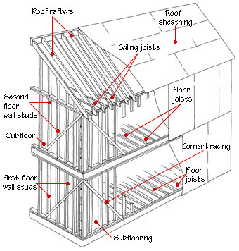 بدلا من استخدام الأخشاب الثقيلة لتأطير منزل، كما كان النمط في أوروبا وجزء كبير من شرق الولايات المتحدة، ويتكون الهيكل العظمي للمنزل بالون بسيطة 2 X 4S، 2 X 8S، و 1 X 10S مسمر معا لجعل الروافد، ودبابيس و العوارض الخشبية.